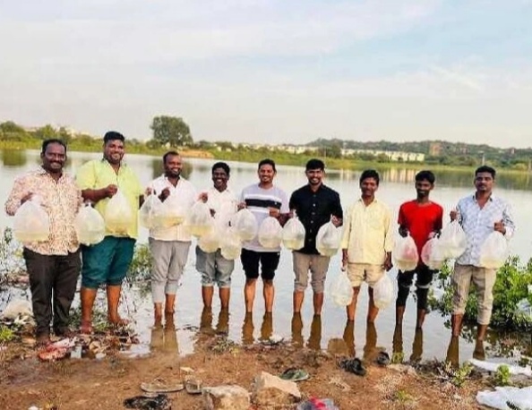 చేప పిల్లలను చెరువులో వదిలిన మత్స్యకారులు..