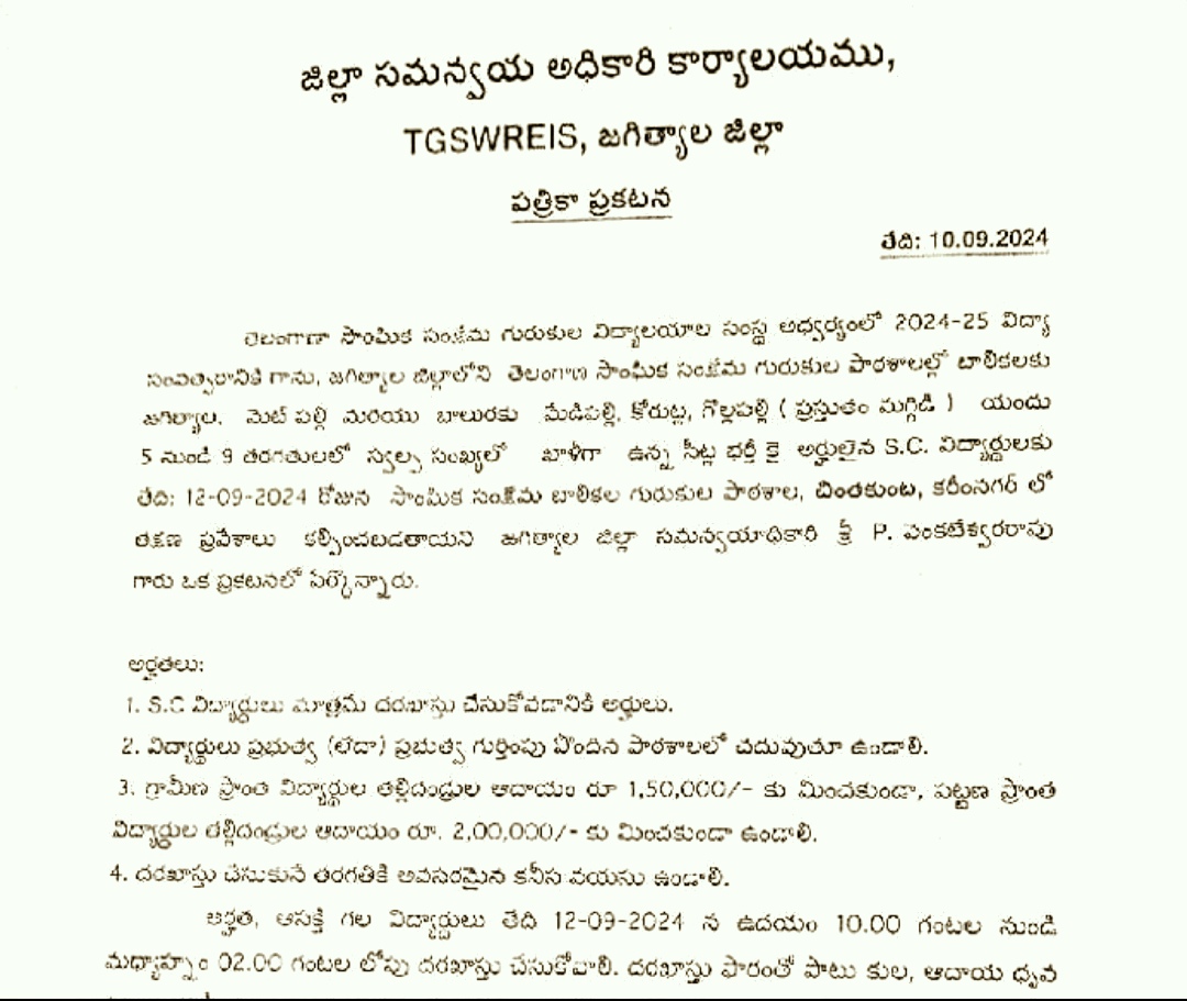 తెలంగాణ గురుకుల విద్యాలయాల సంస్థల ఆధ్వర్యంలో గురుకుల పాఠశాలల్లో (బాలికలకు) జగిత్యాల, మెట్పల్లి (బాలురకు) మేడిపల్లి, కోరుట్ల, గొల్లపల్లిలో 5 నుంచి 9వ తరగతుల్లో ఖాళీగా ఉన్న...