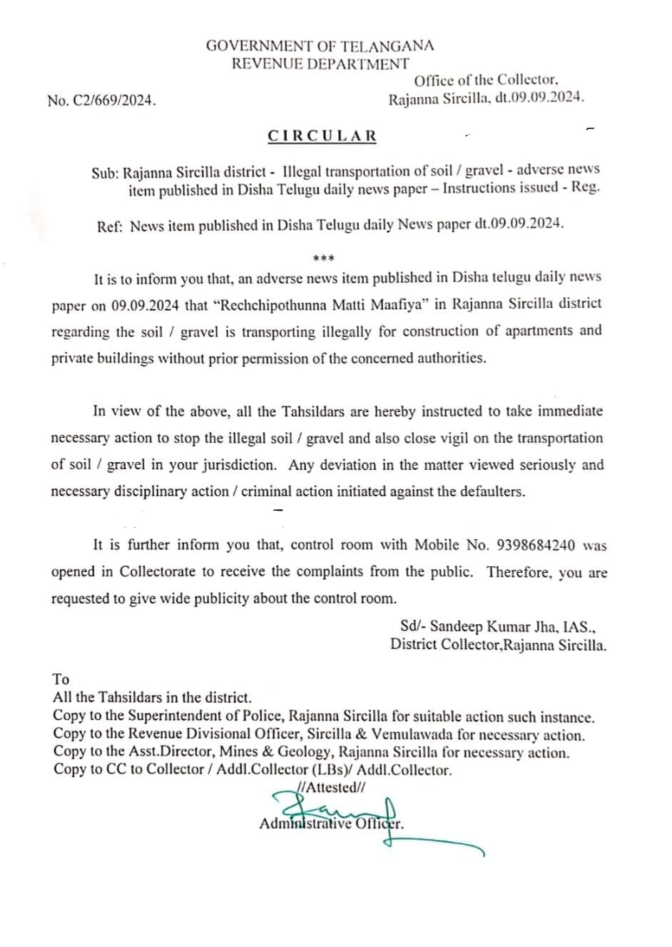 రాజన్న సిరిసిల్ల జిల్లాలో ఎక్కడైనా అక్రమంగా, అనుమతి లేకుండా మట్టికానీ, కంకర తవ్వకాలు జరిగినా, వాహనాల ద్వారా రవాణా జరిగినా కలెక్టర్ కార్యాలయంలో ఏర్పాటు చేసిన కంట్రోల్...