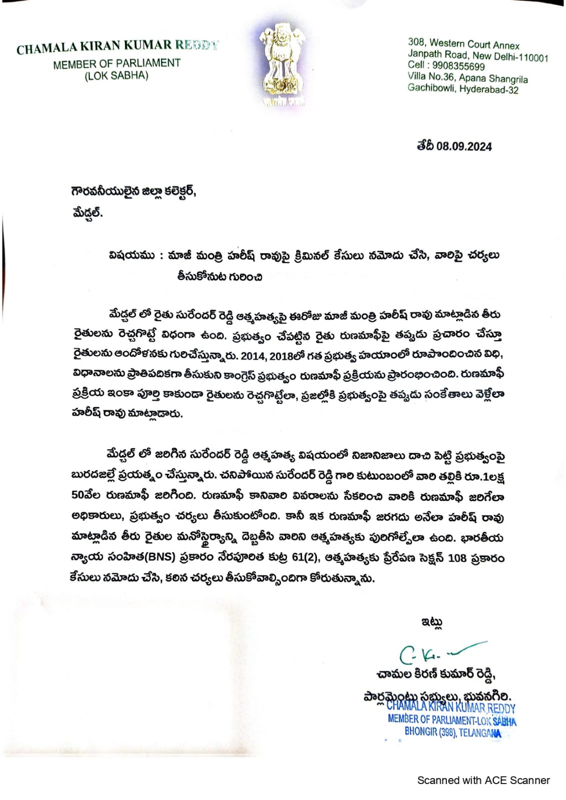 ఎమ్మెల్యే హరీష్ రావుపై క్రిమినల్ కేసు నమోదు చేయాలని మేడ్చల్ జిల్లా కలెక్టర్ కు ఎంపీ చామల కిరణ్ కుమార్ రెడ్డి లేఖ రాశారు. మేడ్చల్ లో...