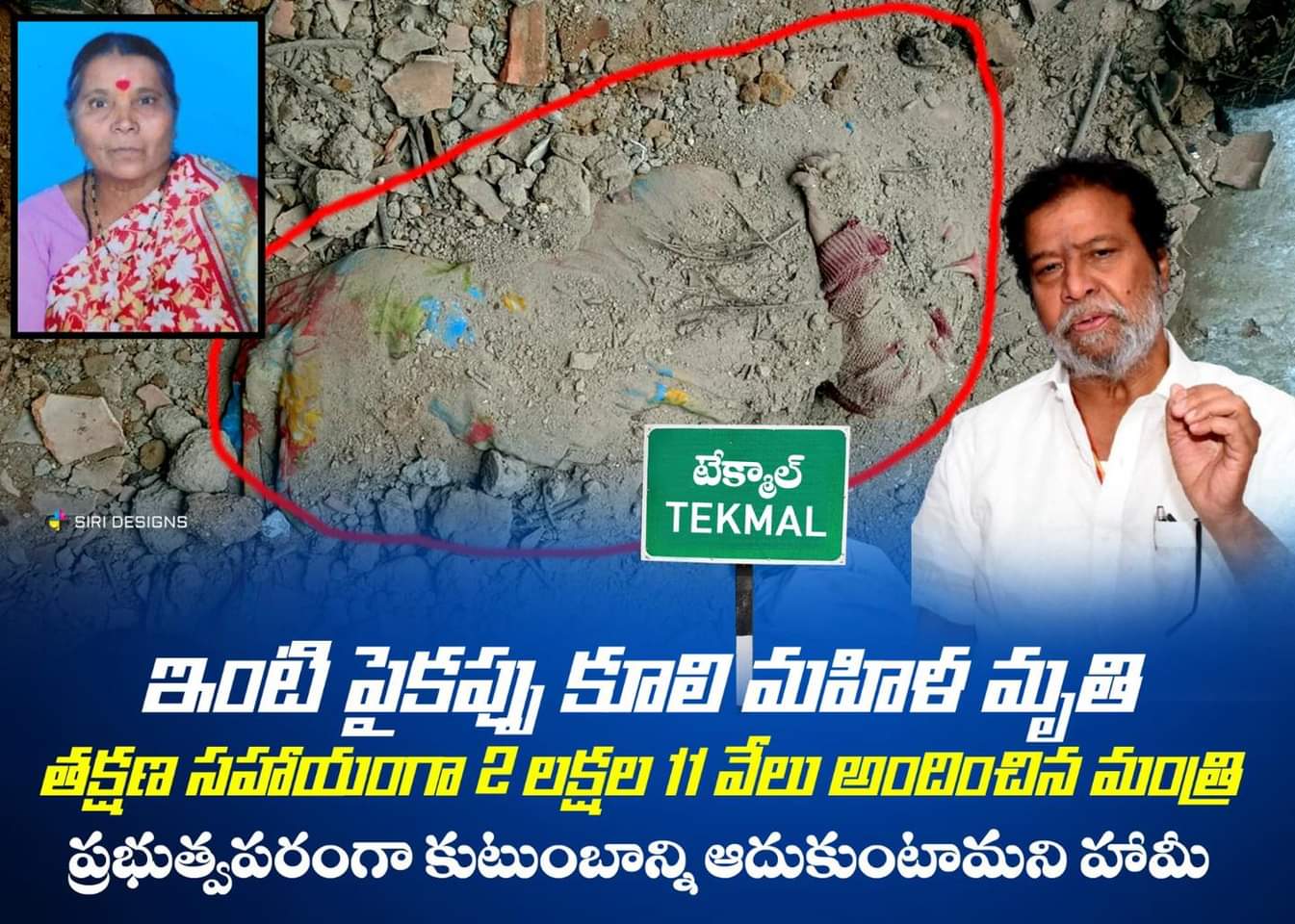 ఆందోల్ నియోజకవర్గంలోని టేక్మాల్ మండల కేంద్రానికి చెందిన మంగలి శంకరమ్మ భర్త దత్తయ్య ఇటీవల కురిసిన భారీ వర్షాల వల్ల ఇంటి మిద్దె కూలి అకాల మరణం...