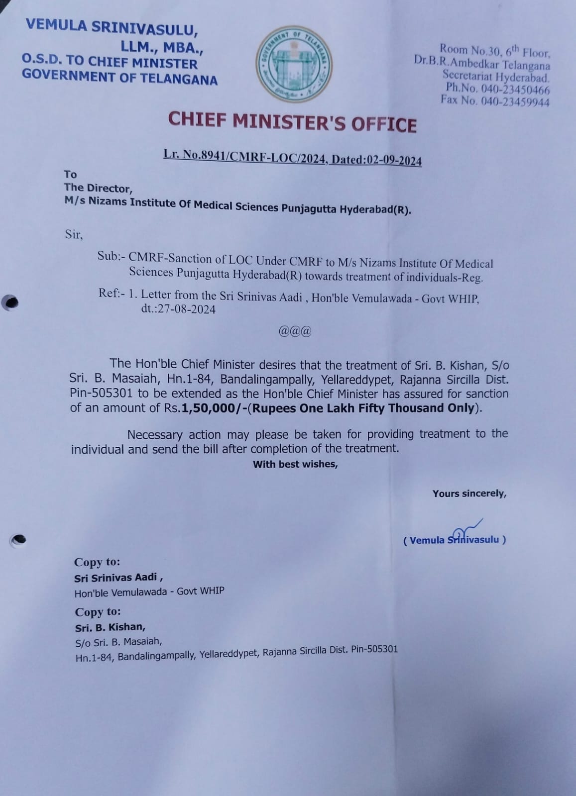 సిరిసిల్ల జిల్లా ఎల్లారెడ్డిపేట మండలం బండలింగంపల్లి గ్రామానికి చెందిన బి. కిషన్ అనారోగ్య సమస్యల వలన అత్యవసర చికిత్స అవసరం అయింది. స్పందించిన వేములవాడ ఎమ్మెల్యే ఆది...