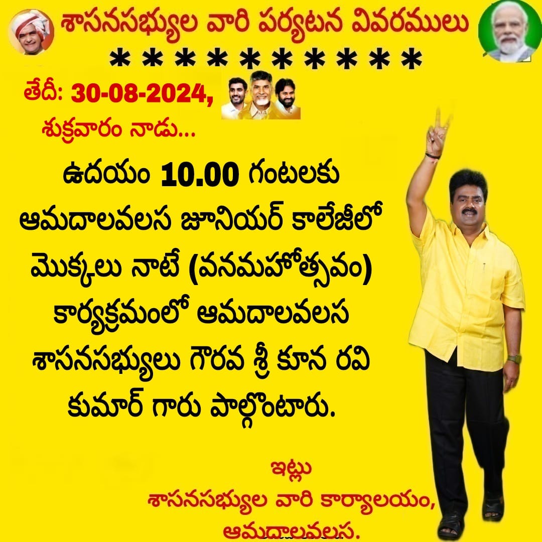 “వనం మనం” కార్యక్రమములో ఆమదాలవలస ఎమ్మెల్యే కూన రవి కుమార్ శుక్రవారం ఉదయం 10 గంటలకు మున్సిపాలిటి పరిధిలో గల ప్రభుత్వ జూనియర్ కాలేజ్ ప్రక్కన...