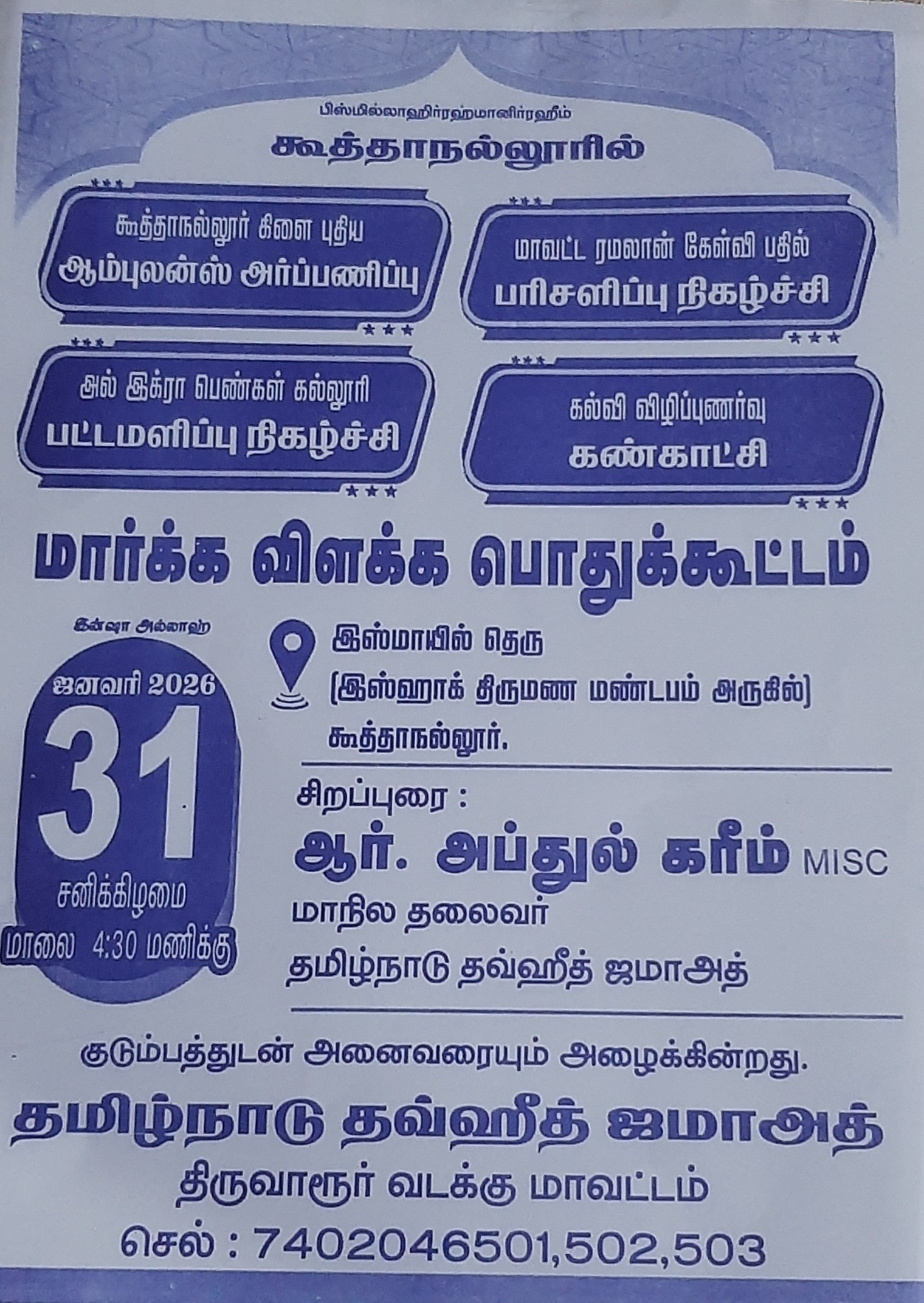 கூத்தாநல்லூர் தமிழ்நாடு தவ்ஹீத் ஜமாஅத் கிளை சார்பாக ஜன.31 நாளை மாலை 4:30 மணிக்கு இஸ்மாயில் தெரு தனியார் திருமண மண்டபத்தில் 1.ஆம்புலன்ஸ் அர்ப்பணிப்பு 2.ரமலான் மாத...