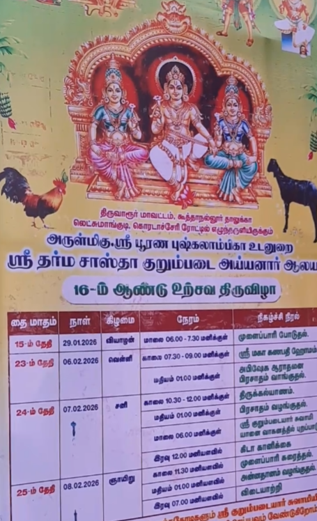 கூத்தாநல்லூர் லெட்சுமாங்குடி மெயின்ரோட்டில் அமைந்துள்ள ஸ்ரீபூரண புஷ்கலாம்பிகா உடனுறை ஸ்ரீதர்ம சாஸ்தா குறும்படை அய்யனார் ஆலயத்தின் 16-ம் ஆண்டு உற்சவ திருவிழா விமரிசையாக நடைபெற இருக்கிறது. இவ்விழாவின்...
